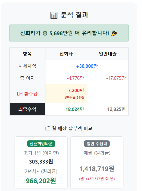 이 두 가지를 비교해서 "신희타가 0000만 원 더 이득입니다!"라고 명쾌하게 알려줍니다.