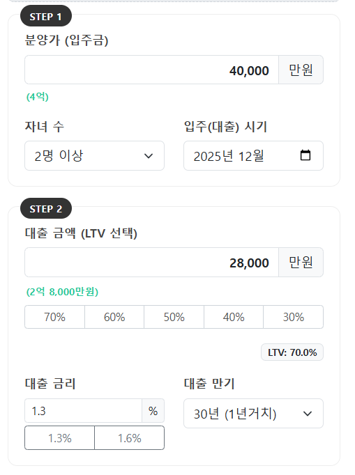 - 조건: 분양가 4억 / LTV 70% / 자녀 2명 / 20년 거주